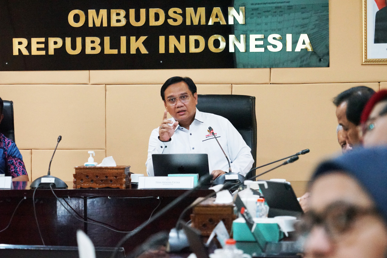 Anggota Ombudsman RI, Yeka Hendra Fatika memimpin Rapat Evaluasi Perkembangan Penyerapan Pupuk Bersubsidi yang dihadiri oleh perwakilan Kementerian Pertanian, Kementerian Keuangan, dan PT. Pupuk Indonesia di Gedung Ombudsman RI, Jakarta Selatan, pada Selasa (27/8/2024).