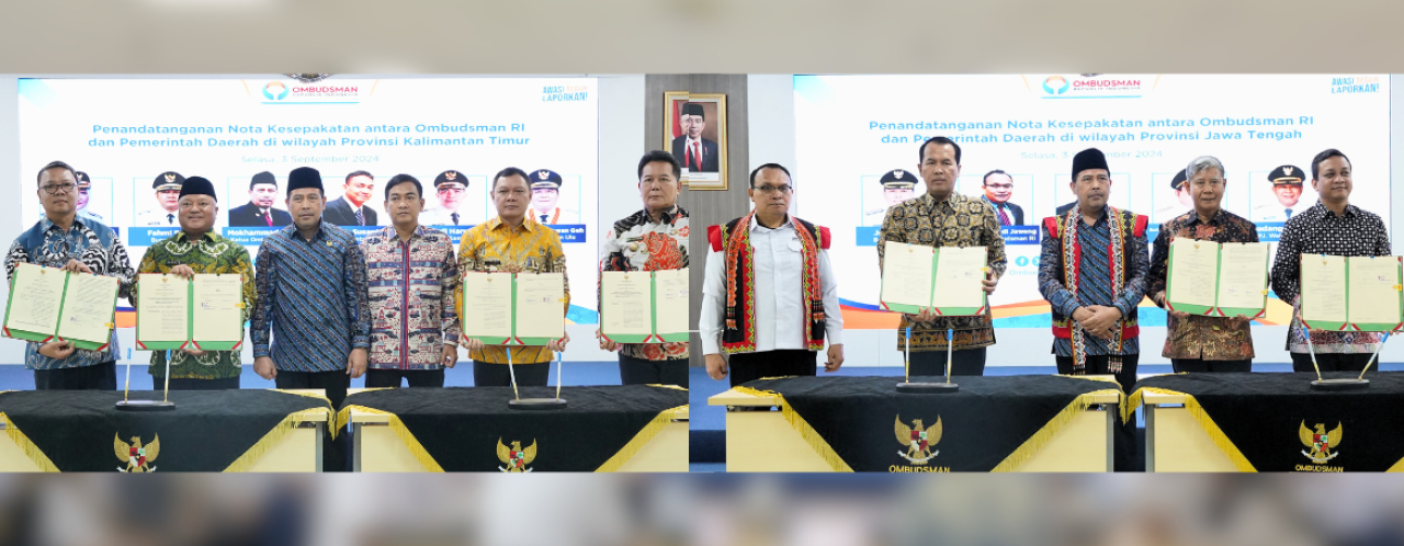 Ketua Ombudsman RI Mokhammad Najih didampingi Anggota Ombudsman RI, Hery Susanto dan Robert Na Endi Jaweng berfoto bersama dengan Sekretaris Daerah Kota Samarinda Hero Mardanus Satyawan, Pj. Walikota Tegal Dadang Soemantri, Walikota Pekalongan Achmad Afzan Arslan Djunaid, Wakil Bupati Berau Gamalis, Bupati Paser Fahmi Fadli, Bupati Mahakam Ulu Bonifasius Belawan Geh, dan Bupati Wonogiri Joko Sutopo setelah penandatanganan Nota Kesepakatan antara Ombudsman RI bersama Pemda Kaltim dan Jateng, Selasa (3/9/3034) di Kantor Ombudsman RI, Jakarta Selatan.
