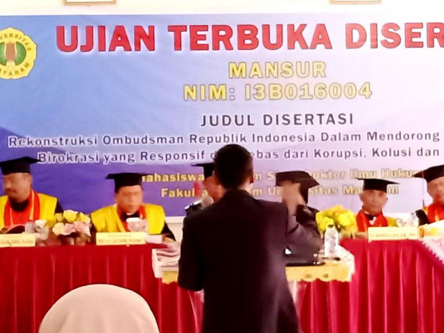 MATARAM - Mansur, Kepala Dinas Pemuda dan Olahraga (Kadispora) Kota Mataram berhasil meraih gelar doktornya pada Sidang Ujian Terbuka Disertasi Program Studi Doktor Ilmu Hukum Fakultas Hukum Universitas Mataram (Unram), Jum'at (9/8/2019). Gelar doktor berhasil diraih usai dirinya berhasil mempertahankan disertasinya yang berjudul "Rekonstruksi Ombudsman RI Dalam Mendorong Budaya Hukum Birokrasi Yang Responsif Dan Bebas Dari KKN."