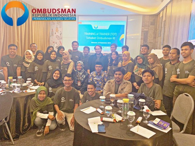 Hotel Ibis Styles Makassar (Selasa, 24 September 2019) Ombudsman RI Perwakilan Sulsel melakukan kegiatan Training of Trainer (ToT) kepada 27 (dua puluh tujuh) Sahabat Ombudsman yang merupakan gabungan masyarakat yang berasal dari beberapa instansi. Adapun 27 orang tersebut merupakan hasil, setelah sebelumnya Ombudsman melakukan penjaringan calon Sahabat Ombudsman selama 2 hari yang diikuti oleh 147 orang yang selanjutnya diseleksi menjadi 27 orang;