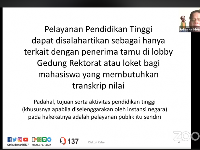 Hal itu disampaikan oleh Anggota Ombudsman RI, Prof. Adrianus Meliala, pada acara dialog virtual yang mengangkat topik "New Normal Pelayanan Pendidikan Tinggi" yang diselenggarakan Ombudsman RI Perwakilan Kalsel (Rabu,03/06/2020).