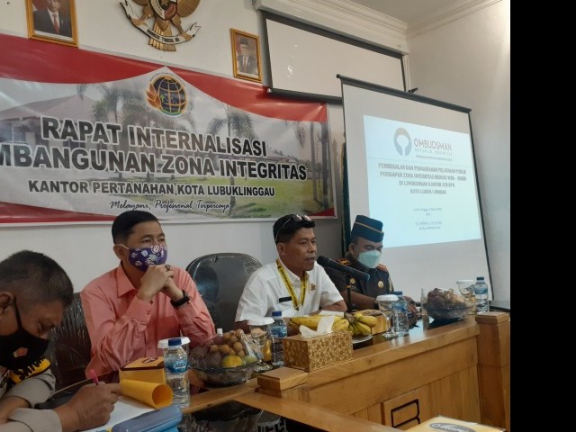 Lubuklinggau - Kepala Perwakilan Ombudsman RI Sumsel, M. Adrian Agustiansyah menjadi narasumber dalam kegiatan Rapat Internalisasi Pembangunan Zona Integritas BPN Kota Lubuklinggau, Rabu (3/3/2021).