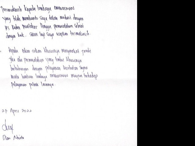 Atas hal tersebut, Pelapor merasa puas dengan pelayanan Ombudsman Jambi dan menyampaikan pesan serta kesan. "Terima kasih kepada Ombudsman yang telah membantu saya dalam mediasi dengan Terlapor hingga permasalahan selesai dengan baik. Kepada masyarakat Jambi jika ada permasalahan yang timbul khususnya berhubungan dengan pelayanan kesehatan, segera meminta bantuan Ombudsman," tulis Pelapor.
