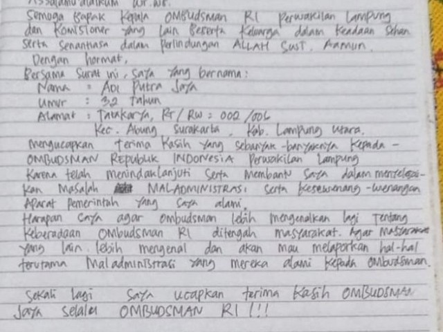 Seorang eks tenaga kontrak berinisial APJ menyampaikan laporan kepada Perwakilan Ombudsman RI Provinsi Lampung terkait belum dibayarkannya honor bulan Agustus sampai Desember 2019 oleh pihak Dinas Pariwisata Kabupaten Lampung Tengah. APJ adalah pegawai kontrak di Dinas Pariwisata Kabupaten Lampung Tengah yang diangkat sejak tahun 2017 sampai awal tahun 2021 dan diberi honor per bulannya sebesar Rp800.000,00 (delapan ratus ribu rupiah).