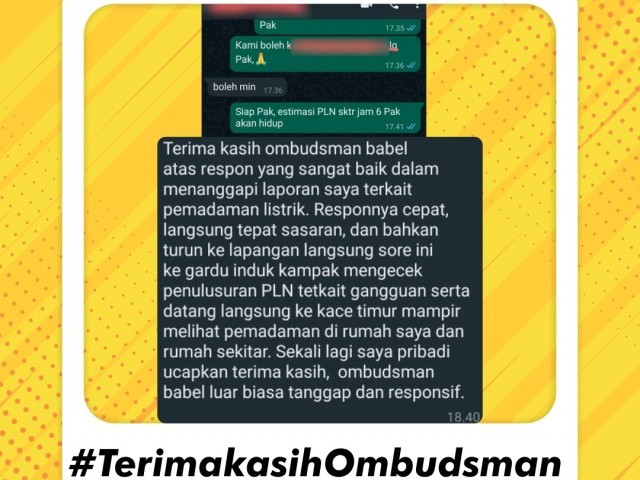 "Terima kasih Ombudsman Babel atas respons yang sangat baik dalam menanggapi laporan saya terkait pemadaman listrik. Responsnya cepat, langsung tepat sasaran, dan bahkan turun ke lapangan langsung sore ini ke gardu induk Kampak untuk mengecek penelusuran PLN terkait gangguan serta datang langsung ke Desa Kace Timur mampir melihat pemadaman di rumah saya dan rumah sekitar. Sekali lagi saya pribadi ucapkan terima kasih, Ombudsman Babel luar biasa tanggap dan responsif," tulis Pelapor dalam testimoni yang dikirimkannya melalui pesan WA.