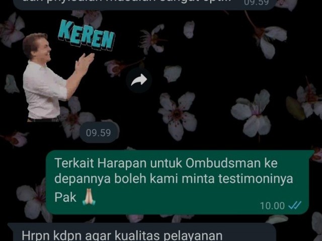 "Saya sangat puas atas kinerja Ombudsman Babel karena tindak lanjut dan penyelesaian masalah sangat cepat," ujar Firman selaku Pelapor.