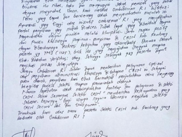 Atas saran dan masukan Ombudsman Republik Indonesia Perwakilan Jawa Tengah, Pemerintah Kabupaten Rembang memutuskan akan menerima pelamar yang "menulis tangan/ tidak mengetik" Surat Pernyataan sesuai ketentuan Pasal 52 Peraturan Menteri Pendayagunaan Aparatur Negara dan Reformasi Birokrasi Nomor 27 Tahun 2021 tentang Pengadaan Pegawai Negeri Sipil. Pemerintah Kabupaten Rembang telah mengumumkan hasil sanggah pada tanggal 20 Agustus 2021 melalui Pengumuman Nomor 810/1804/2021 dengan hasil Pelapor dan 739 peserta lainnya dinyatakan lulus seleksi administrasi.