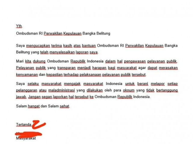 "Mari kita dukung pemerintah dalam pengawasan pelayanan publik secara transparan agar masyarakat dapat merasakan kenyamanan dalam pelayanan tersebut. Kita harus berani laporkan setiap maladministrasi yang dilakukan oleh oknum-oknum yang tidak bertanggung jawab kepada Ombudsman Republik Indonesia", ujar KF dalam testimoninya atas penyelesaian laporan. Â