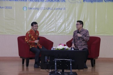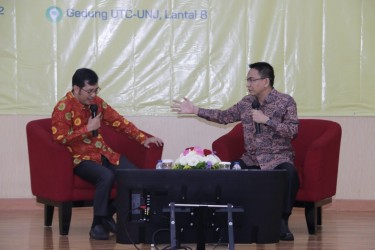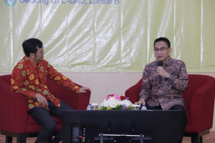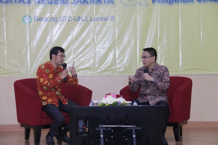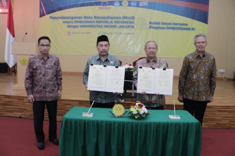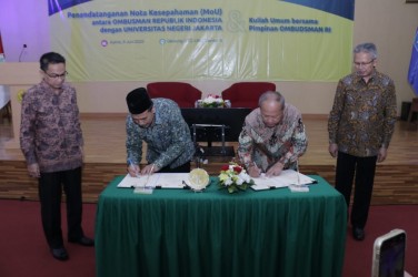Ketua Ombudsman RI Mokhamad Najih bersama Rektor Universitas Negeri Jakarta Komarudin menandatangani Nota Kesepahaman antara Ombudsman RI dan Universitas Negeri Jakarta terkait Peningkatan Kualitas Pelayanan Publik di Lingkungan Universitas Negeri Jakarta