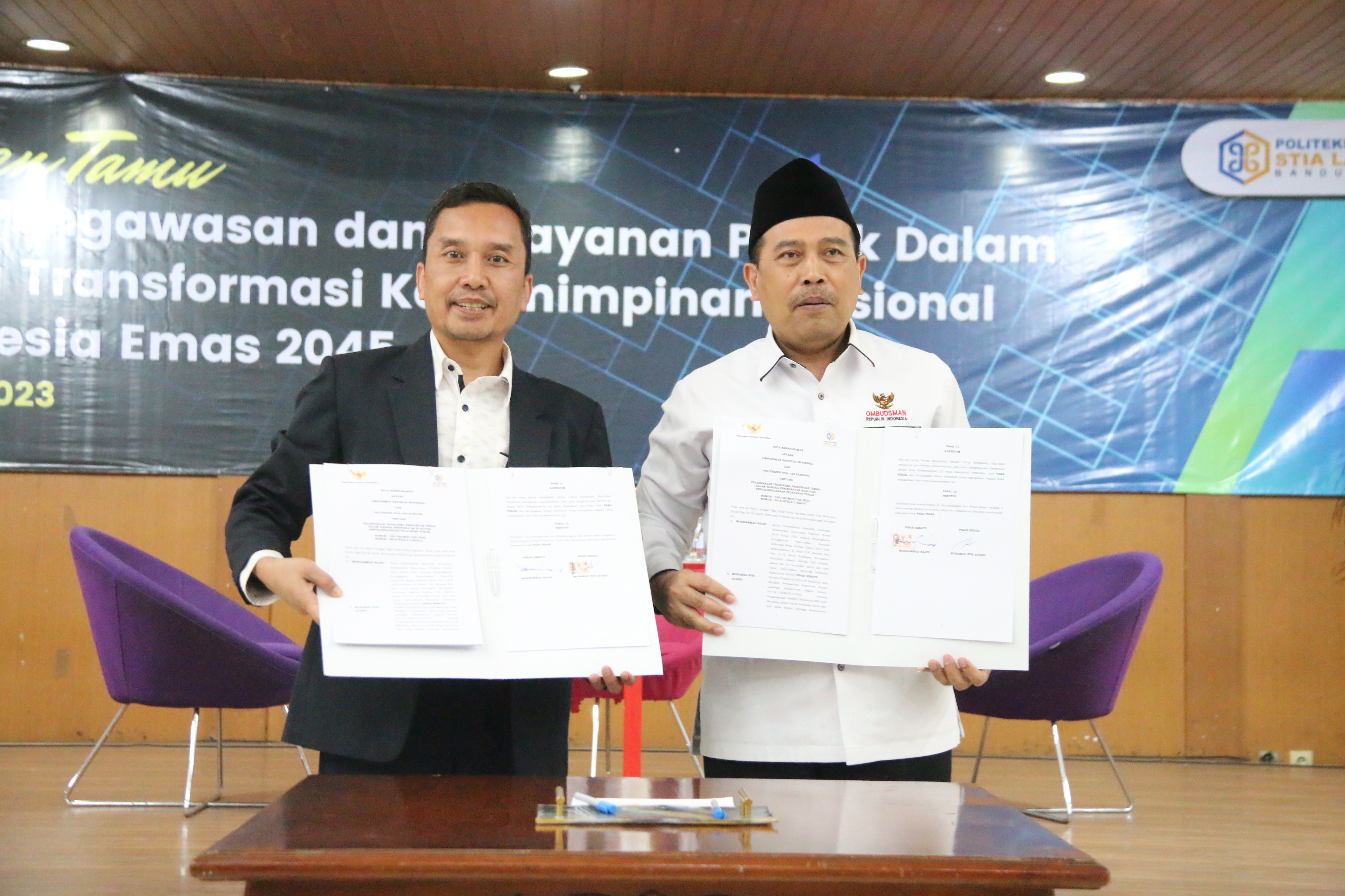 Bandung - Dalam rangka pencegahan maladministrasi pada pelayanan publik dan sinergi bersama perguruan tinggi, Ketua Ombudsman RI Mokhammad Najih bersama Direktur Politeknik Sekolah Tinggi Ilmu Administrasi Lembaga Administrasi Negara (STIA LAN) Bandung, Muhamad Nur Afandi, melakukan penandatanganan Nota Kesepahaman, pada Rabu (30/08/2023) di gedung Politeknik STIA LAN Bandung.