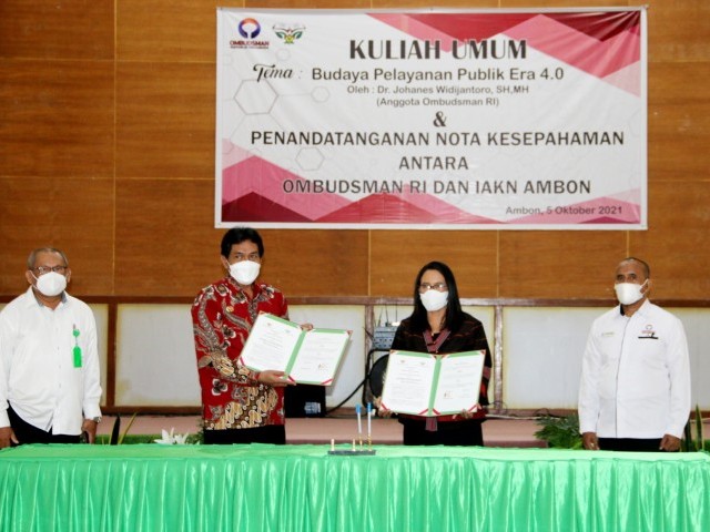 AMBON- Anggota Ombudsman RI Johanes Widijantoro bersama Rektor Institut Agama Kristen Negeri (IAKN) Ambon, Agusthina CH Kakiay menandatangani nota kesepahaman tentang Pelaksanaan Tri Darma Perguruan Tinggi dalam Peningkatan Kualitas Pelayanan Publik, pada Selasa (5/10/2021) di Auditorium Kampus IAKN Ambon. Penandatanganan ini merupakan upaya bersama kedua belah pihak untuk bersama-sama meningkatkan kualitas pelayanan publik khususnya di bidang pendidikan tinggi serta pencegahan maladministrasi.