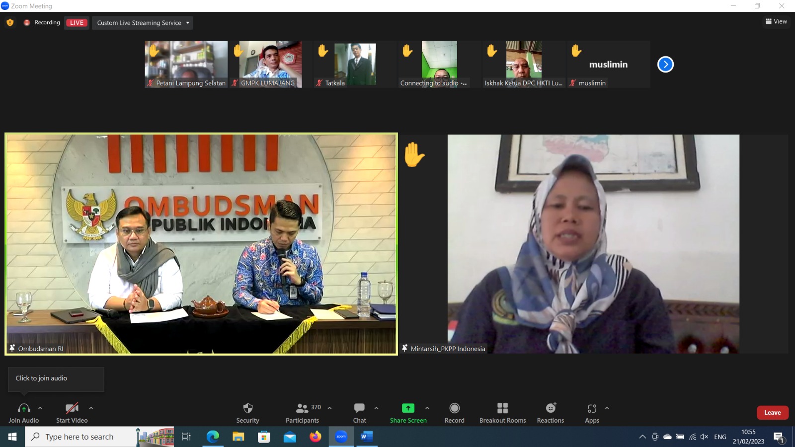 JAKARTA - Ombudsman RI menyelenggarakan forum konsultasi pengaduan daring tentang permasalahan penyaluran dan penebusan pupuk bersubsidi pada musim tanam 2023, Selasa (21/2/2023). Forum ini menjadi wadah bagi masyarakat khususnya petani, penyuluh pertanian maupun distributor hingga pengecer pupuk bersubsidi untuk menyampaikan keluhan maupun permasalahan di lapangan.