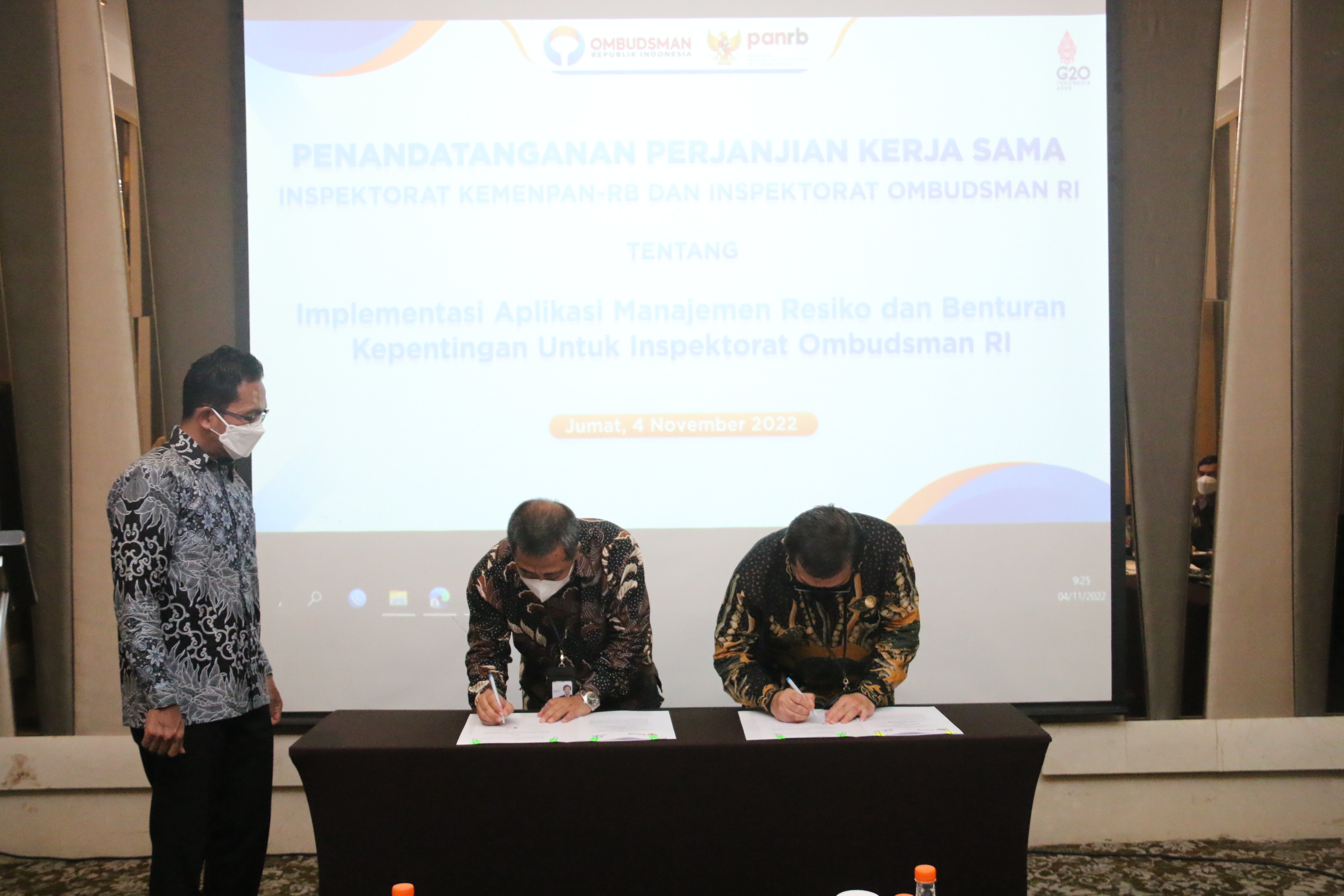 Jakarta - Inspektorat Ombudsman RI dan Inspektorat Kementerian Pendayagunaan Aparatur Negara Reformasi Birokrasi (KemenpanRB) menjalin kerja sama implementasi aplikasi manajemen risiko dan benturan kepentingan berbasis web untuk mengelola data risiko secara terpadu, Jumat (4/11/2022). Perjanjian kerja sama tersebut ditandatangani oleh Inspektur Ombudsman RI Marsetiono dengan Inspektur KemenpanRB, Aan Syaiful Ambia.