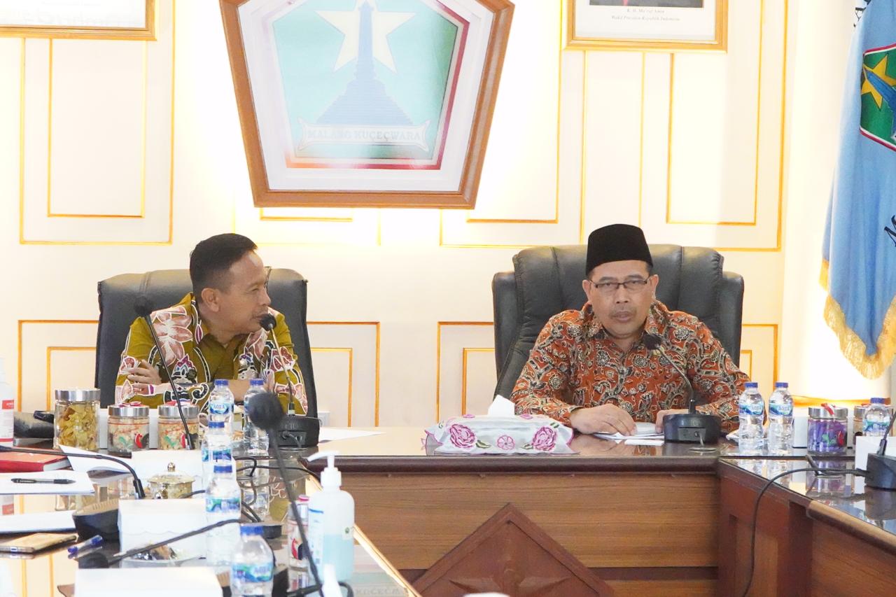 MALANG - Sebagai upaya monitoring Laporan Masyarakat di wilayah Kota Malang, Ketua Ombudsman RI Mokhammad Najih menemui langsung Penjabat (Pj) Wali Kota Malang Wahyu Hidayat yang didampingi oleh Sekretaris Daerah (Sekda) Kota Malang Erik Setyo Santoso dan jajaran, serta Ketua Komisi C DPRD Kota Malang, Fathol Arifin, Jumat (31/5/2024) di Balai Kota Malang.