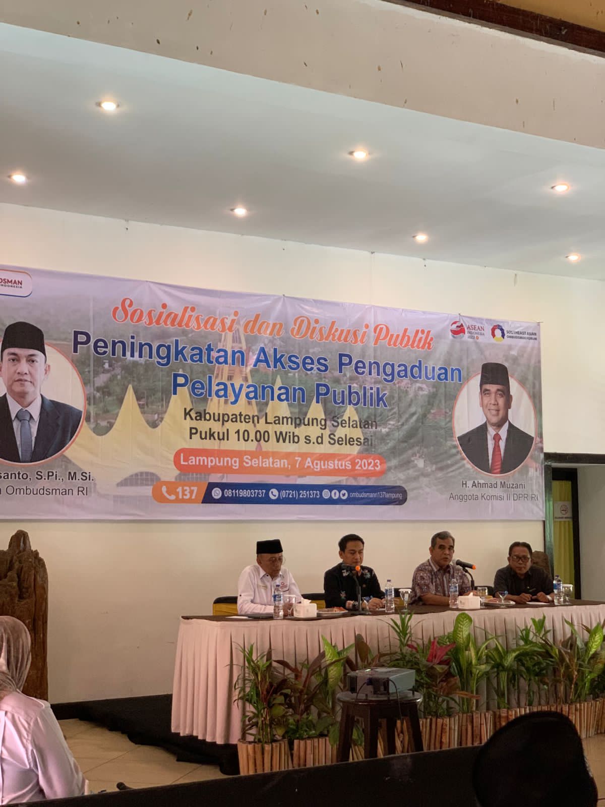 LAMPUNG - Anggota Ombudsman RI, Hery Susanto dan Anggota Komisi II DPR RI Ahmad Muzani keduanya menjadi pembicara dalam acara yang bertajuk Sosialisasi dan Diskusi Publik Peningkatan Akses dan Pengaduan Pelayanan Publik ini diselenggarakan di Hotel Grand Elty Krakatoa pada Senin (07/08). Kegiatan ini kerjasama antara Ombudsman RI dan DPR RI.