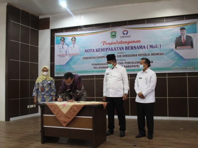 SOLOK- Anggota Ombudsman RI, Yeka Hendra Fatika melakukan penandatanganan Nota Kesepahaman (MoU) antara Ombudsman RI dengan Pemerintah Kabupaten Solok Sumatera Barat, tentang Peningkatan Kualitas Penyelenggaraan Pelayanan Publik di Kabupaten Solok, Rabu (19/5/2021), bertempat di Kantor Dinas Penanaman Modal dan Perizinan Terpadu Satu Pintu (DPMPTSP) Kabupaten Solok.