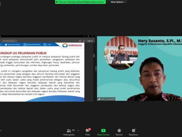 JAKARTA - Anggota Ombudsman RI, Hery Susanto menjadi narasumber dalam kegiatan Serial Zoominari "Transformasi Digital Pelayanan Publik dengan Artificial Intelligence, Big Data dan Smart Blockchain (Rancangan UU Pelayanan Publik Prolegnas 2021-2024)" yang diselenggarakan secara daring pada Rabu (28/7/2021).