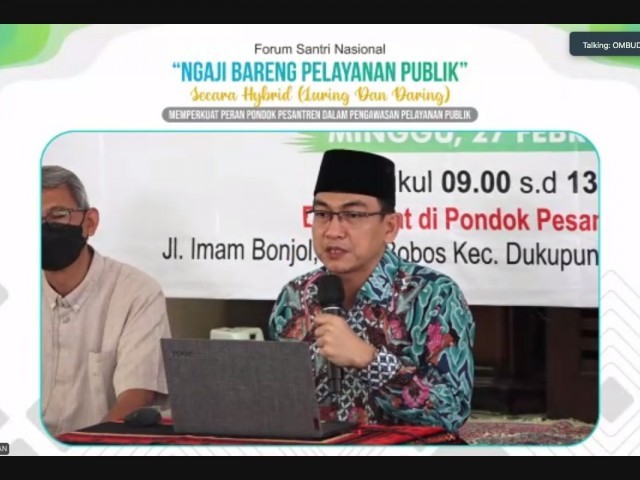 Anggota Ombudsman Hery Susanto mengajak seluruh elemen pondok pesantren berperan aktif dalam mengawasi pelayanan publik. Hal itu diungkap Hery dalam diskusi daring yang digelar oleh Forum Santri Nasional (FSN) pada Minggu (27/2).