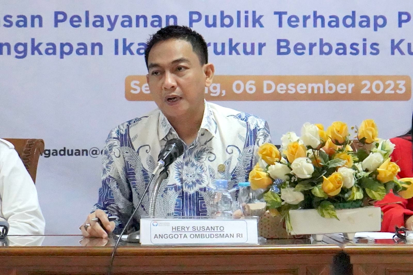 Hal ini disampaikan oleh Anggota Ombudsman RI Hery Susanto saat memberikan sambutan pada kegiatan Focus Group Discuccion (FDG) Penyampaian Kajian "Pengawasan Pelayanan Publik Terhadap Penerapan kebijakan Penangkapan Ikan Terukur (PIT) Berbasis Kuota dan Zona", Rabu (06/12/2023) di Aula Dinas Kelautan dan Perikanan Provinsi Jawa Tengah.