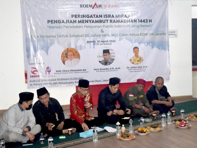 Jakarta - Anggota Ombudsman RI, Hery Susanto mengajak masyarakat untuk ikut berperan serta dalam pengawasan pelayanan publik karena masyarakat sebagai garda depan yang secara langsung mengalami pelayanan publik. Hal tersebut disampaikan Hery Susanto dalam kegitan Peringatan Isra Miraj dan Pengajian Menyambut Ramadhan 1443 H dengan tema "Menuju Peradaban Pelayanan Publik Indonesia yang Ramah" yang diselenggarakan oleh Roemah Djoeang Indonesia pada Kamis (10/3/2022) di Aula Sekretariat Roemah Djoeang.