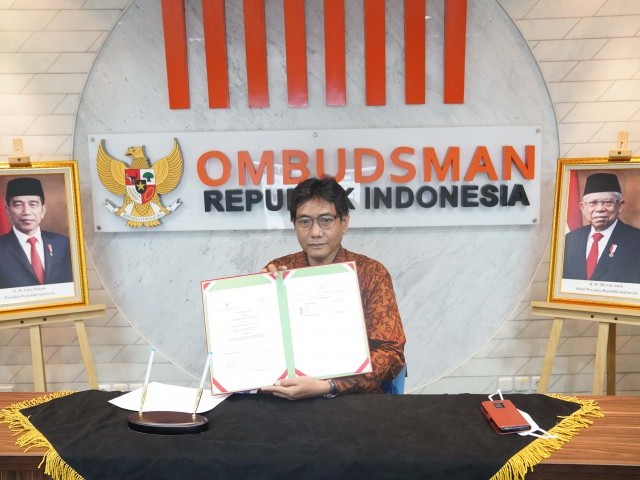 JAKARTA-Anggota Ombudsman RI Johanes Widijantoro melakukan penandatanganan Nota Kesepahaman bersama Rektor Universitas Negeri Surabaya (UNESA) Nurhasan secara daring pada Selasa (21/12/2021).