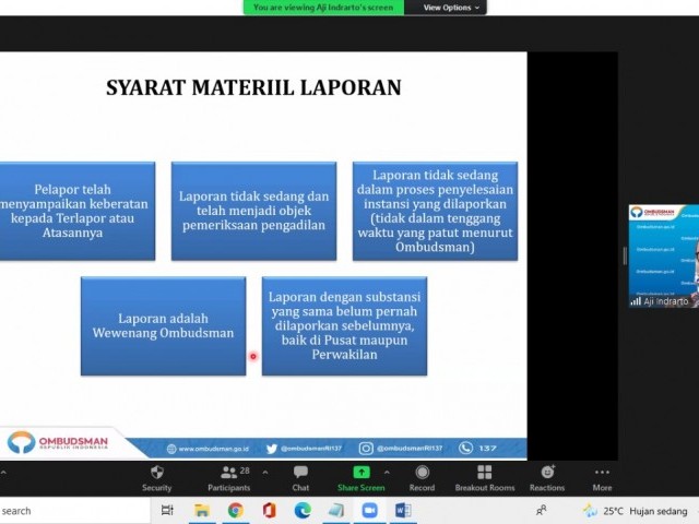 Sedangkan syarat materiil adalah hal-hal yang bersifat subtantif atau berkaitan dengan kewenangan Ombudsman yang harus dipenuhi saat menyampaikan laporan. "Misalnya substansi yang dilaporkan sesuai dengan wewenang Ombudsman RI, laporan tidak sedang menjadi objek pemeriksaan oleh Pengadilan, kecuali menyangkut tindakan maladministrasi dalam proses pemeriksaan di Pengadilan," jelas Aji.