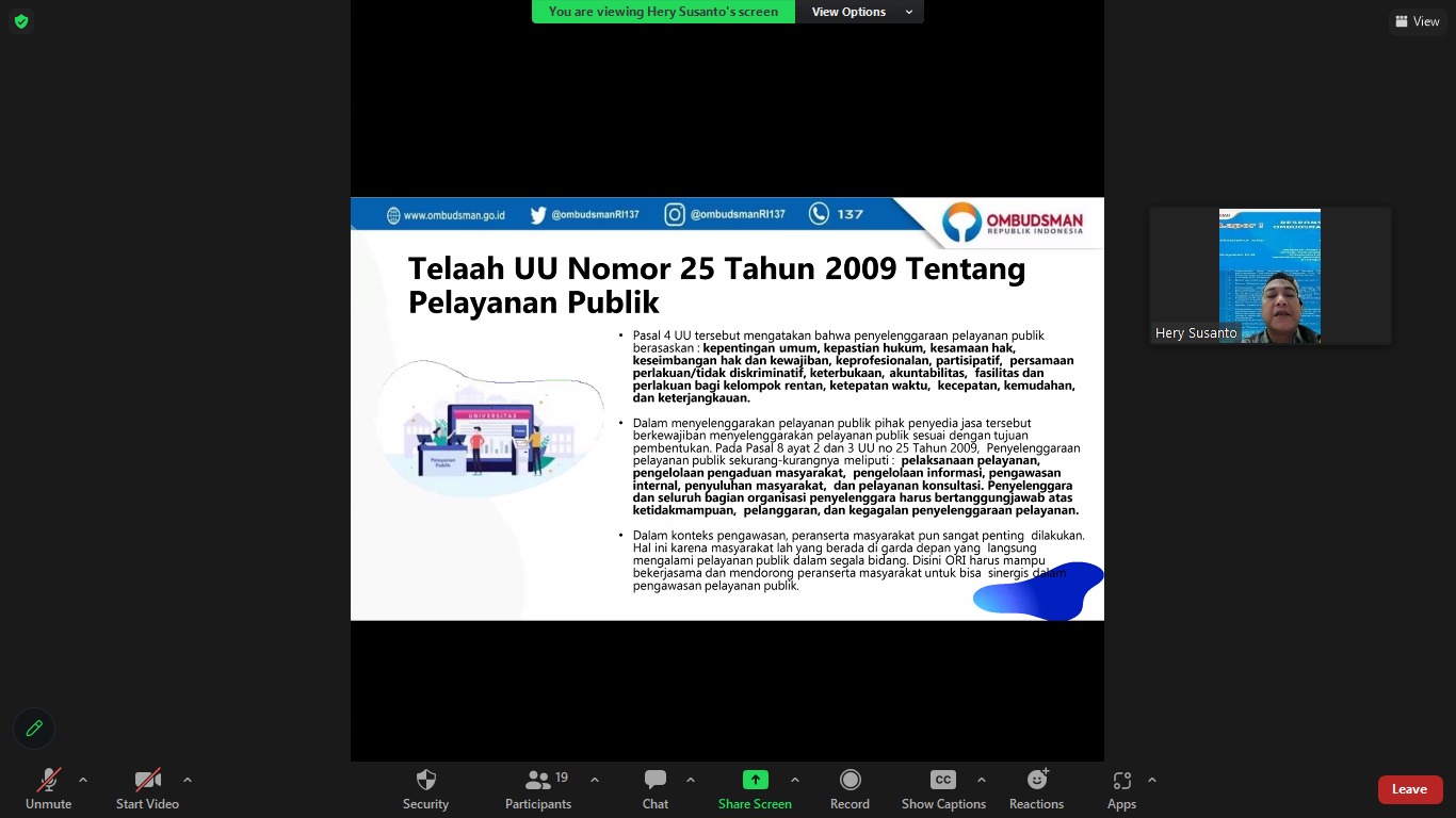JAKARTA - Negara berkewajiban memenuhi kebutuhan setiap warganya melalui sistem pemerintahan yang mendukung terciptanya penyelenggaraan pelayanan publik yang berkualitas dalam rangka memenuhi kebutuhan dasar dan hak sipil atas barang publik, jasa publik, dan pelayanan administratif. Hal ini ditegaskan oleh Anggota Ombudsman RI, Hery Susanto saat menjadi narasumber pada Advance Training Nasional Badan Koordinasi Himpunan Mahasiswa Islam (Badko HMI) Kalimantan Selatan-Tengah pada Selasa, (20/6/2023) yang dilaksanakan secara hybrid.