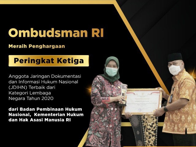 JAKARTA- Ombudsman RI meraih peringkat ketiga Anggota Jaringan Dokumentasi dan Informasi Hukum Nasional (JDIHN) terbaik Tahun 2020, kategori Lembaga Negara. Penghargaan diserahkan secara langsung oleh Kepala Badan Pembinaan Hukum Nasional (BPHN) Kementerian Hukum dan HAM RI, Prof R. Benny Riyanto kepada Kepala Biro Hukum, Kerja Sama dan Organisasi Ombudsman RI, Dwi Ciptaningsih pada Kamis (26/11/2020) Aula Moedjono Gedung BPHN, Jakarta.