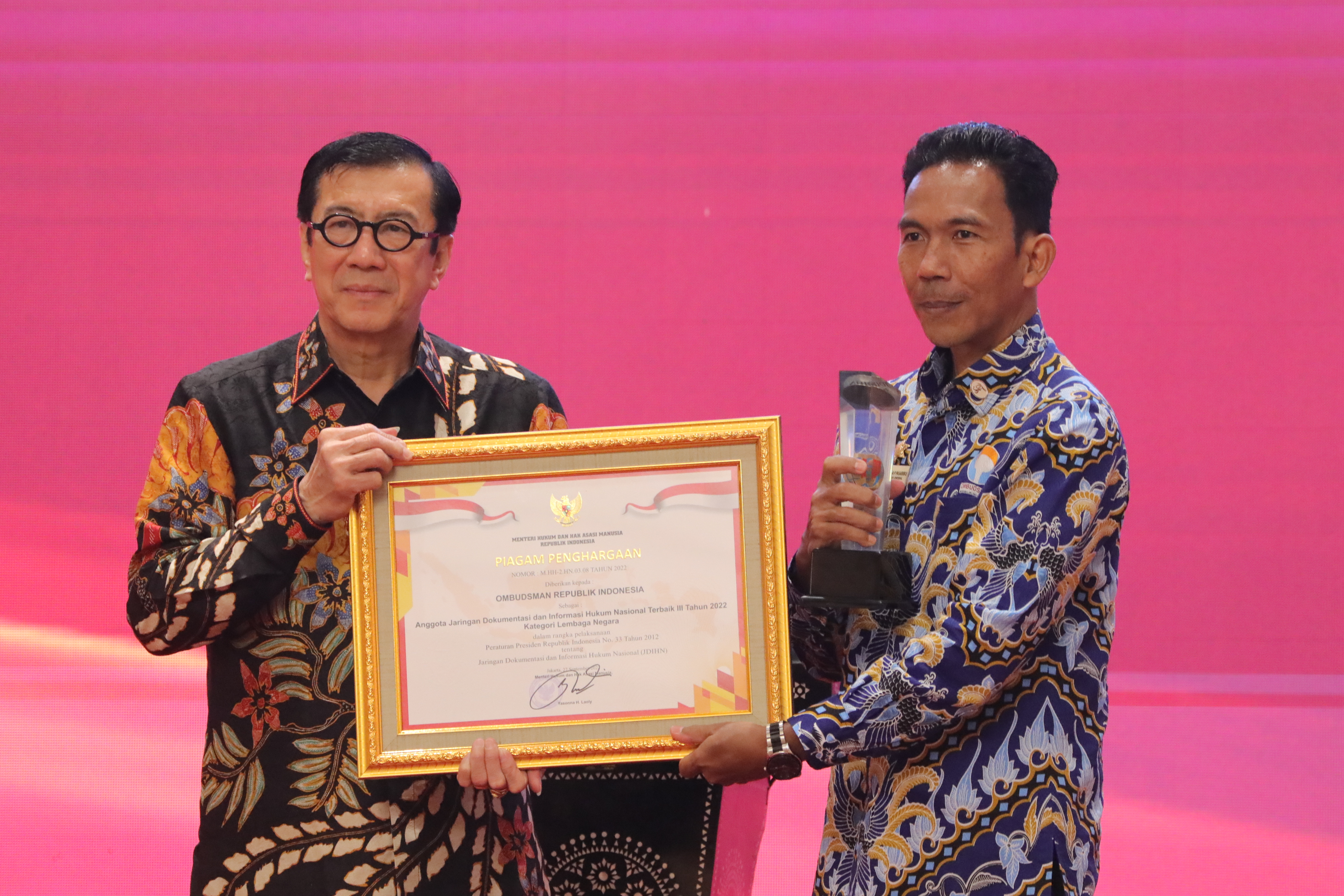Pengelolaan JDIH merupakan mandat Peraturan Presiden Nomor 33 Tahun 2012 tentang Jaringan Dokumentasi dan Informasi Hukum Nasional. Penghargaan Anggota JDIHN Terbaik telah dimulai tahun 2018 dengan aspek penilaian organisasi, sumber daya manusia, koleksi dokumen hukum, teknis pengelolaan, sarana prasarana, pemanfaatan teknologi informasi dan komunikasi, serta inovasi. Secara berturut-turut Ombudsman RI dari tahun 2020-2022 berhasil meraih Peringkat 3, Peringkat 4, dan Peringkat 3. (NI)