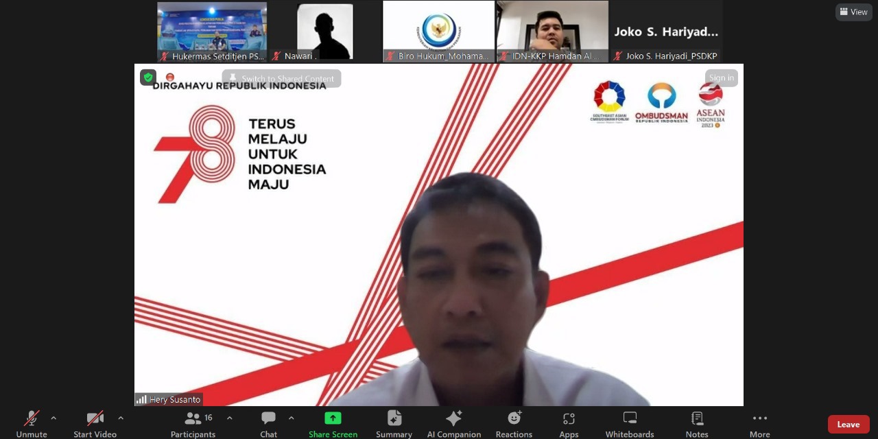 Anggota Ombudsman RI Hery Susanto menyampaikan bahwa Permen KKP No. 23 tahun 2021 tentang standar laik operasi kapal perikanan dan sistem pemantauan kapal tidak saja perlu mengatur kewajiban namun juga harus mengakomodir hak-hak nelayan. Demikian disampaikannya secara daring saat menjadi narasumber Konsultasi Publik bertopik "Peran Ombudsman dalam Penyusunan Kebijakan Publik dan Pengawasan Kebijakan Publik" yang ditaja Direktorat Jenderal Pengawasan Sumberdaya Kelautan dan Perikanan Kementerian Kelautan dan Perikanan, Rabu, (22/11/2023) di Hotel MG Setos Kota Semarang Propinsi Jawa Tengah.