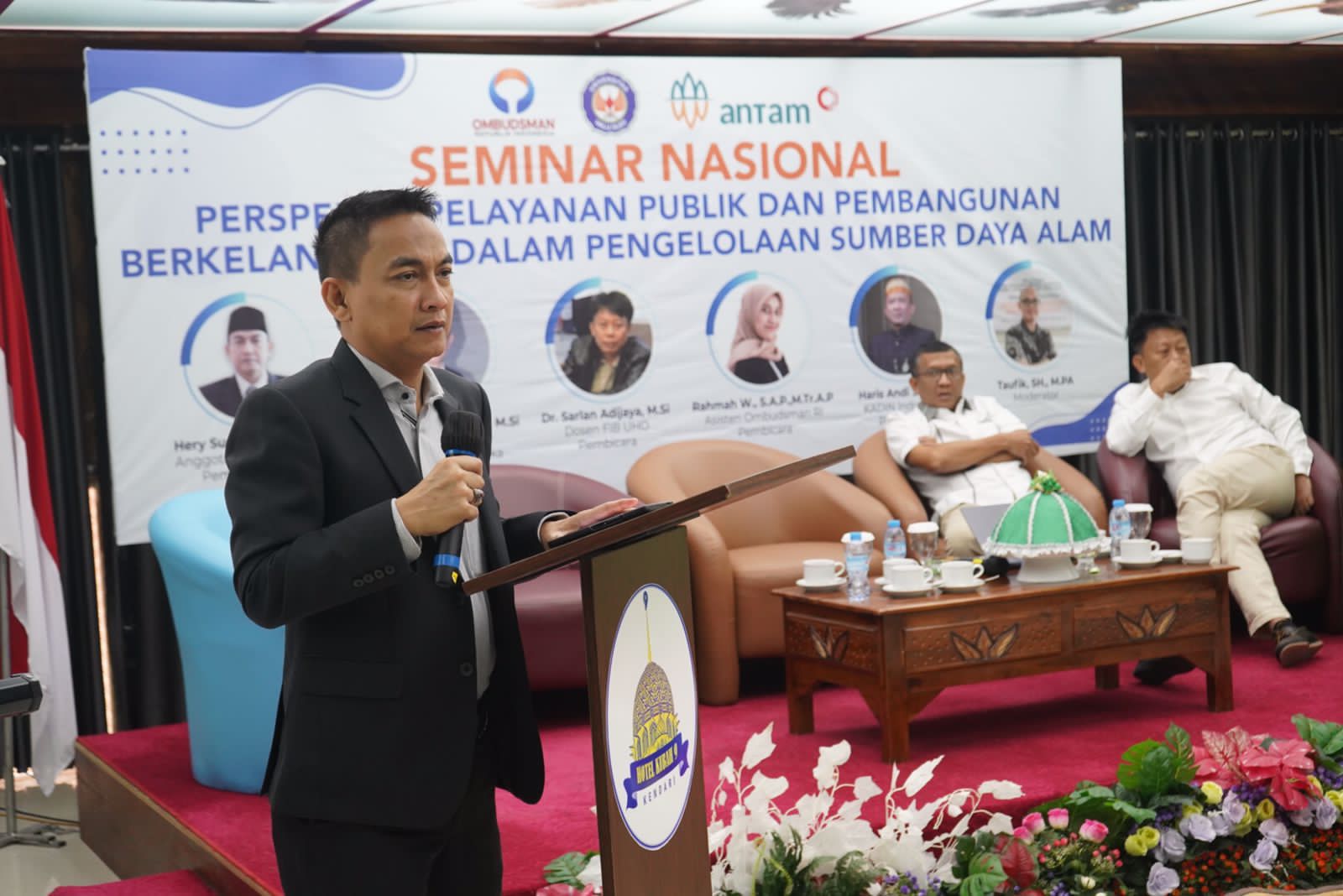 KENDARI - Anggota Ombudsman RI, Hery Susanto menjadi Keynote Speaker dalam Seminar Nasional Perspektif Pelayanan Publik dan Pembangunan Berkelanjutan Dalam Pengelolaan Sumber Daya Alam (SDA) yang diselenggarakan oleh Fisip Universitas Halu Oleo di Hotel 9 Kubah, Kendari pada Rabu (27/09).