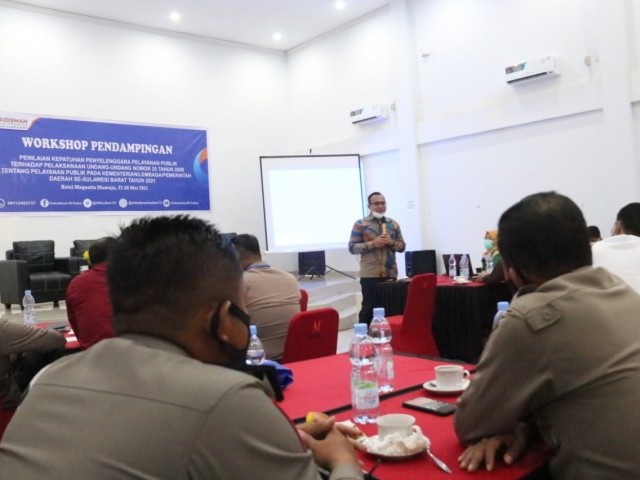 MAMUJU - Anggota Ombudsman RI, Robert Na Endi Jaweng kembali membuka Workshop Pendampingan Penilaian Kepatuhan terhadap Standar Pelayanan Publik 2021 yang diselenggarakan oleh Kantor Perwakilan Ombudsman Sulawesi Barat pada Jum'at, 28 Mei 2021 di Hotel Meganita Mamuju. Dalam workshop tersebut hadir Wakil Kapoda Sulawesi Barat, Kapolres Mamuju Tengah, dan Kapolda Mamasa.