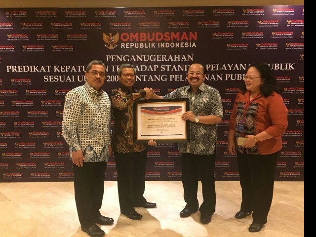 Penganugerahan Predikat Kepatuhan diberikan oleh Wakil Presiden RI bersama dengan Prof. Amzulian Rifai sebagai Ketua Ombudsman RI. Penganugerahan Predikat Kepatuhan wujud dari hasil penilaian kepatuhan standar pelayanan publik yang dilakukan secara mandiri oleh Ombudsman RI dan dibagi dalam 2 (dua) kategori, yaitu