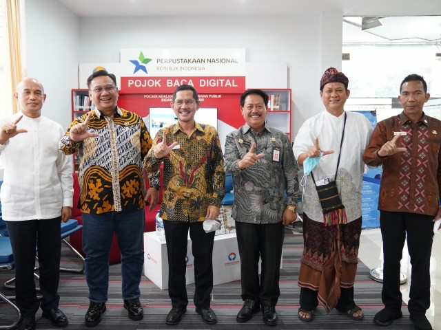 Kuningan, Jakarta Selatan --- Kepala Perpustakaan Nasional Republik Indonesia (Perpusnas), Muhammad Syarif Bando bersama Wakil Ketua Ombudsman, Bobby Hamzar Rafinus, meluncurkan secara resmi Pojok Baca Digital (Pocadi) yang berada di Gedung Ombudsman Republik Indonesia, Jakarta Selatan, Rabu (13/7). Menurut Bobby, terselenggaranya Pocadi ini meningkatkan kelincahan atau agility Sumber Daya Manusia (SDM) Ombudsman.