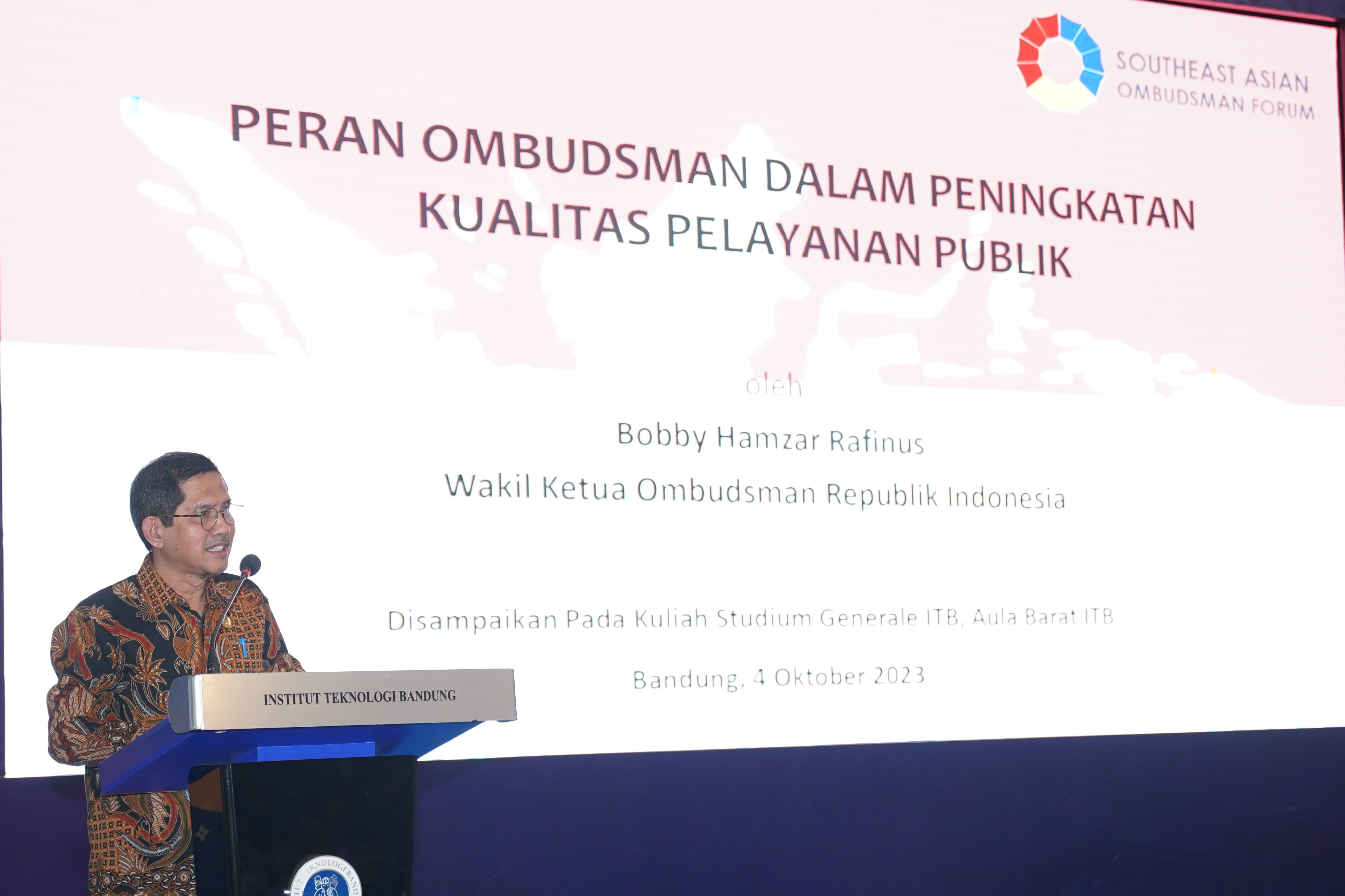Bandung - Luas wilayah Indonesia yang sangat luas dan kondisi birokrasi yang belum ideal menjadi tantangan yang harus dihadapi Ombudsman RI dalam pengawasan pelayanan publik ke depannya. Demikian disampaikan Wakil Ketua Ombudsman RI, Bobby Hamzar Rafinus, saat menyampaikan kuliah umum di Institut Teknologi Bandung, Bandung, Rabu (4/10/2023).