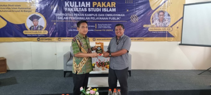 BANJARMASIN - Sinergitas antara Ombudsman dan Perguruan Tinggi menjadi kunci perbaikan pelayanan Publik, hal tersebut diungkapkan Anggota Ombudsman RI Hery Susanto saat menjadi pembicara pada kegiatan Kuliah Pakar di Fakultas Studi Islam UNISKA yang berlangsung secara hybrid dari Ruang Peradilan Semu Fakultas Studi Islam UNISKA MAB,Jumat (21/07).