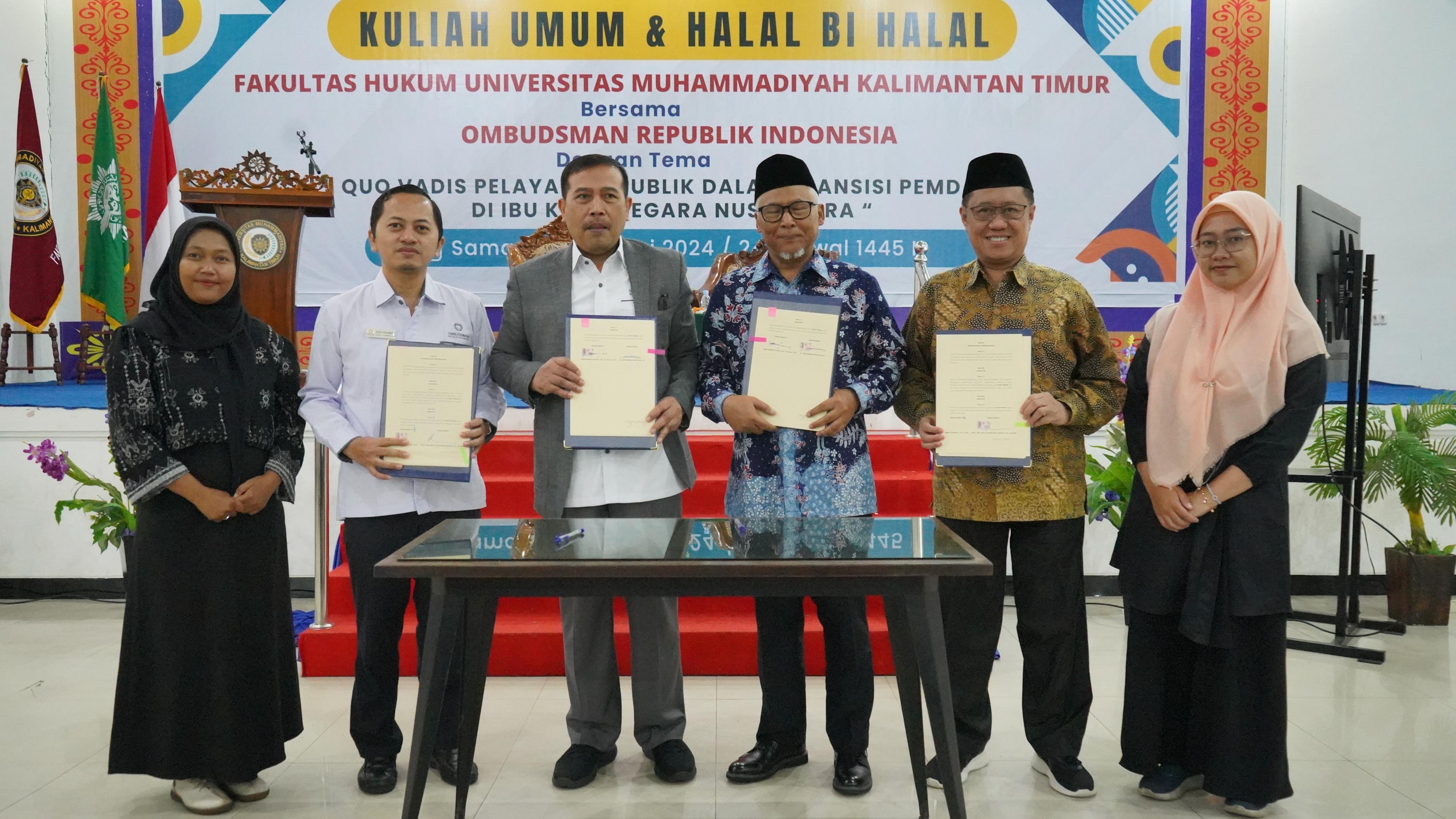SAMARINDA - Lawatan Ketua Ombudsman RI ke Provinsi Kalimantan Timur membuahkan kesepakatan dalam memperkuat pengawasan pelayanan publik. Kesepakatan ini dituangkan dalam penandatanganan Memorandum of Understanding (MoU) oleh Ketua Ombudsman RI, Mokhammad Najih dengan Rektor Universitas Muhammadiyah Kalimantan Timur (UMKT), Muhammad Musiyam yang dilanjutkan dengan penandatanganan Perjanjian Kerja Sama antara Perwakilan Ombudsman RI Provinsi Kalimantan Timur dengan Fakultas Hukum UMKT pada Jumat (3/5/2024) di Gedung UMKT, Samarinda.