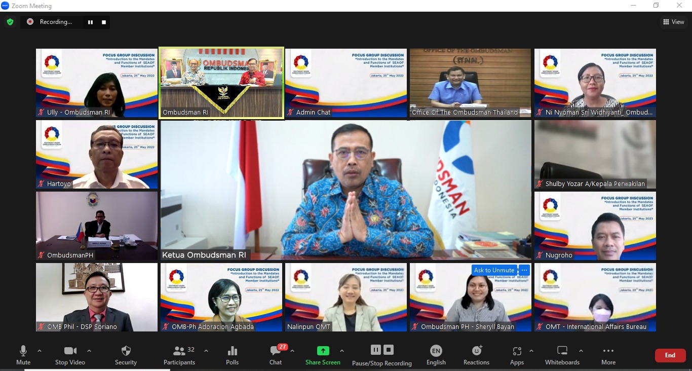 Jakarta - Dalam rangka peningkatkan kapasitas lembaga Ombudsman sebagai lembaga pengawas pelayanan publik serta lembaga pengaduan masyarakat di kawasan Asia Tenggara, Ombudsman RI bersama Ombudsman Filipina dan Ombudsman Thailand mengadakan Focus Group Discussion bertema "Introduction to the Mandates and Functions of SEAOF Member Institutions" secara daring pada Kamis (25/5/2023).
