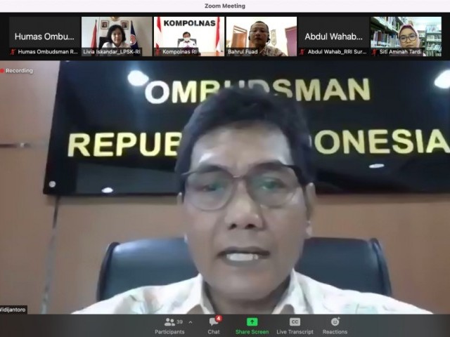 JAKARTA- Anggota Ombudsman RI, Johanes Widijantoro bersama Bahrul Fuad, Komisioner Komnas Perempuan; Livia Iskandar, Wakil Ketua Lembaga Perlindungan Saksi dan Korban (LPSK); Siti Aminah Tardi, Komisioner Komnas Perempuan; dan Benny Jozua Mamoto, Ketua Komisi Kepolisian Nasional (Kompolnas) melakukan konferensi pers dan pembacaan narasi siaran pers terkait Penanganan Kasus Kekerasan Seksual di Pondok Pesantren Shidiqiyah, Jombang pada Kamis (6/1/2021) secara daring.