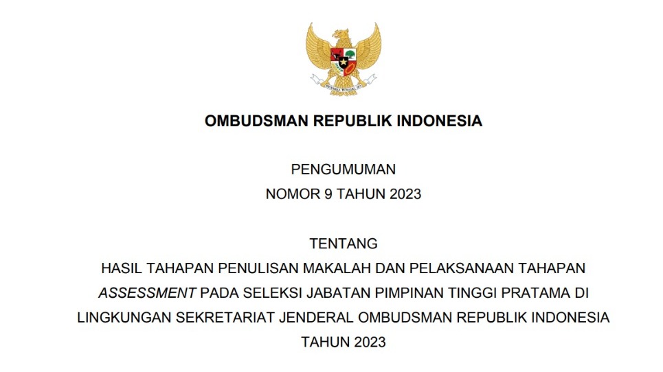 HASIL TAHAPAN PENULISAN MAKALAH DAN PELAKSANAAN TAHAPAN ASSESSMENT PADA SELEKSI JABATAN PIMPINAN TINGGI PRATAMA DI LINGKUNGAN SEKRETARIAT JENDERAL OMBUDSMAN REPUBLIK INDONESIA TAHUN 2023