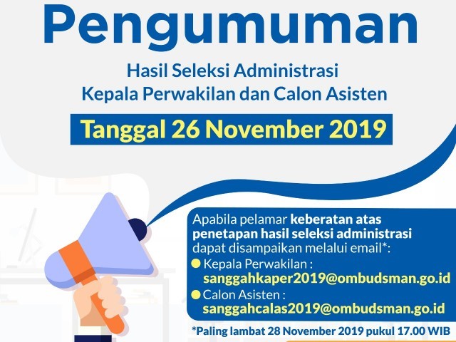 Apabila pelamar keberatan atas penetapan hasil seleksi administrasi dapat disampaikan melalui email: sanggahcalas2019@ombudsman.go.id dengan menuliskan subyek email "Sanggahan Calon Asisten 2019" dan mengisi formulir sanggahan yang dapat diunduh bersamaan dengan pengumuman ini, paling lambat hari Kamis tanggal 28 November 2019 pukul 17.00 WIB.