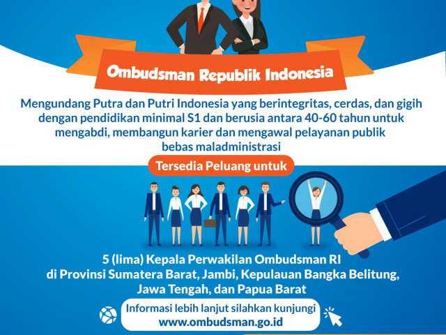 Ombudsman Republik Indonesia mengundang Putera-Puteri terbaik Warga Negara Indonesia yang memiliki komitmen dan integritas tinggi dalam membenahi sektor pelayanan publik di Indonesia untuk mengisi jabatan sebagai Kepala Perwakilan Ombudsman Republik Indonesia.