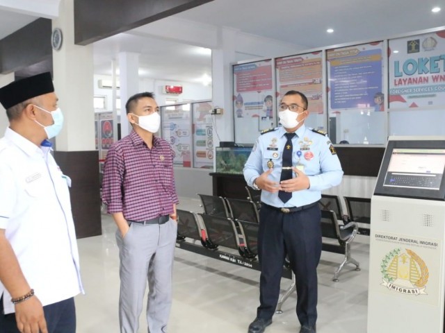 KENDARI - Anggota Ombudsman RI, Hery Susanto didampingi Kepala Perwakilan Ombudsman Sulawesi Tenggara Mastri Susilo mengunjungi Kantor Imigrasi Kelas I Kendari pada Senin (24/5/2021) guna melihat inovasi pelayanan publik. Kantor Imigrasi Kelas I Kendari meraih nilai Wilayah Bebas Korupsi/ Wilayah Birokrasi Bersih Melayani (WBK/WBBM) tertinggi dalam penilaian internal se-Kantor Imigrasi di Indonesia.