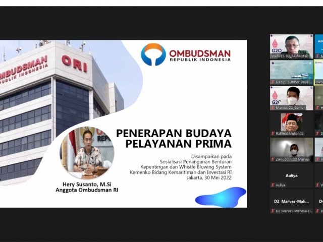 Demikian disampaikan Anggota Ombudsman RI Hery Susanto dalam Sosialisasi Penanganan Benturan Kepentingan dan Whistle Blowing System yang digelar Deputi Bidang Koordinasi Sumber Daya Kemenko Bidang Kemaritiman dan Investasi RI secara daring, Senin (30/5/2022) di Jakarta.