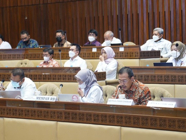 Jakarta - Ketua Ombudsman RI Mokhammad Najih beserta Anggota Ombudsman RI Indraza Marzuki dan Jemsly Hutabarat serta Sekretaris Jenderal Ombudsman RI Suganda Pandapotan Pasaribu hadir dalam Rapat Dengar Pendapat (RDP) bersama Komisi II DPR RI untuk membahas Rancangan Anggaran Pemerintah Belanja Negara 2023 dan Rapat Kerja Pemerintah Tahum 2023 di Ruang Rapat Komisi II Gedung Nusantara DPR RI, Senin (06/06/2022).