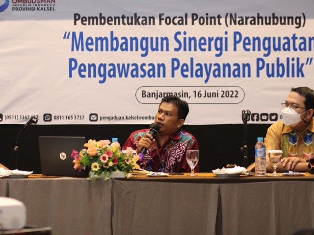 Banjarmasin - Ombudsman RI Perwakilan Provinsi Kalimantan Selatan meminta Inspektorat se-Provinsi Kalimantan Selatan untuk terlibat aktif dalam pencegahan maladministrasi pelyanan publik. Demikian disampaikan Kepala Keasistenan Penerimaan dan Verifikasi Laporan Ombudsman RI Kalimantan Selatan, Sopian Hadi saat menjadi narasumber dalam kegiatan Pembentukan Focal Point (Narahubung) dengan tema "Membangun Sinergi Penguatan Pengawasan Pelayanan Publik" di Hotel Rodhita Banjarmasin, Kamis (16/06/2022).