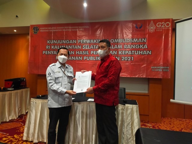Perwakilan Ombudsman RI Kalsel menyerahkan hasil Kepatuhan Standar Pelayanan Kantor Pertanahan (Kantah) se Provinsi kalsel pada 13 April 2022 di Hotel Galaxy Banjarmasin